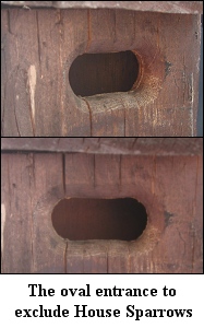 All that being said, the aforementioned oval entrances to your nest boxes will reduce the need to spend time chasing House Sparrows.